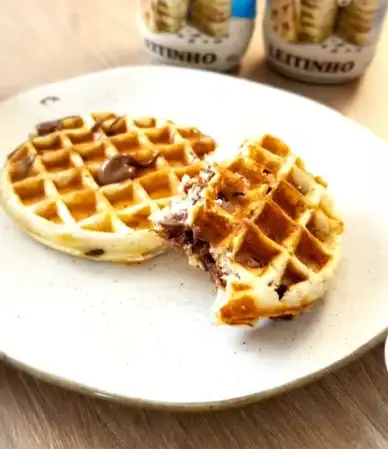 Waffles: Cozinhar por alguns minutos na máquina de waffle, prestando atenção na potência do equipamento, pois o tempo e resultado variam de acordo com ele.